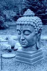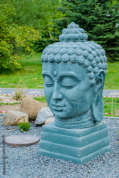 A serene Buddha sculpture stands in a lush green park, surrounded by nature