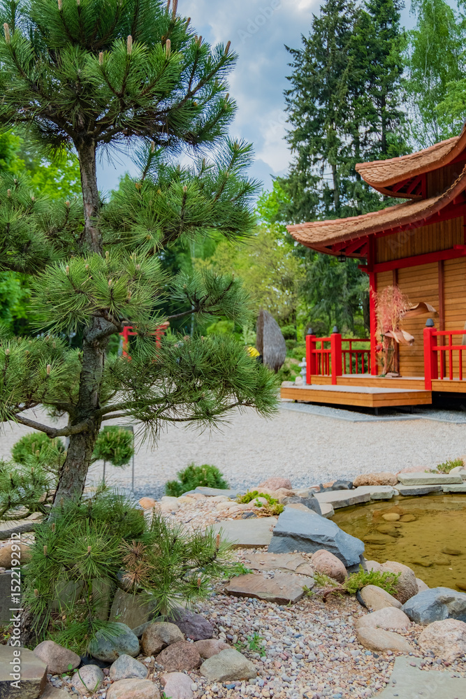 Visitors relish the serene atmosphere of a lush Japanese garden with a tranquil pond