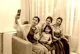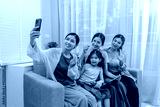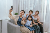 Happy Asian family sitting on cozy living room sofa, bonding and smiling while enjoying time together with children in a warm home.