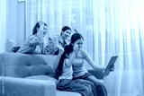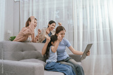 Happy Asian family sitting on cozy living room sofa, bonding and smiling while enjoying time together with children in a warm home.