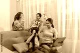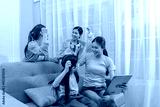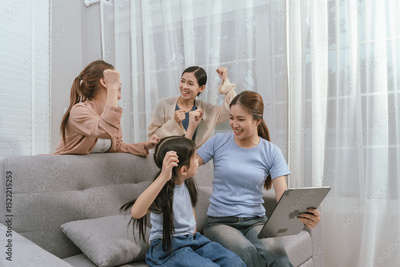 Happy Asian family sitting on cozy living room sofa, bonding and smiling while enjoying time together with children in a warm home.