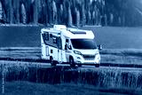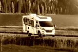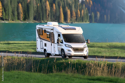 Camper van on road trip through mountains