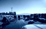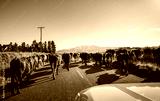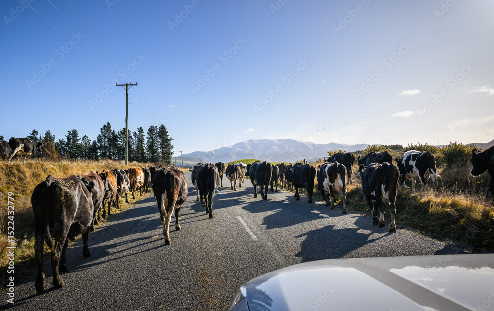 Cows walking on the country road, stopping the traffic. Canterbury, New Zealand.