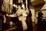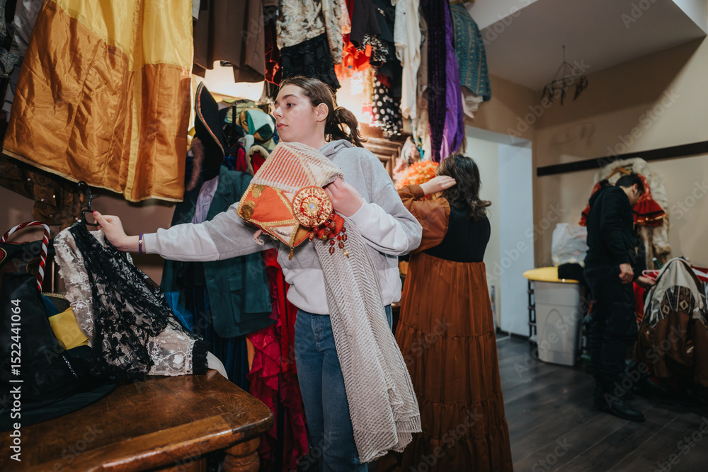 Actors backstage arranging costumes and props, depicting the busy process of preparation for a theatrical performance inside an immersive environment.