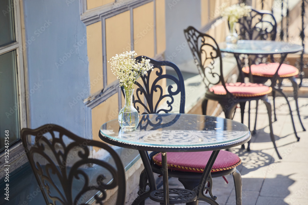 An outdoor table in a cafe. There is a glass vase with a plant on the table. Vintage style
