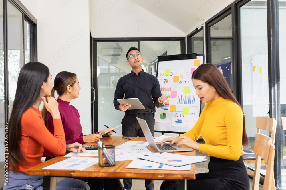Group of Asian business working analysis project brainstorm in modern office, Asian businesspeople team working together, Business startup and company strategy planning concept.