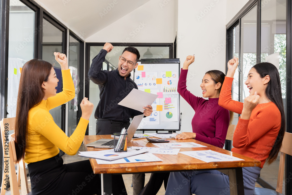 Group of happy asian businesspeople celebrate project brainstorm at modern office.