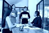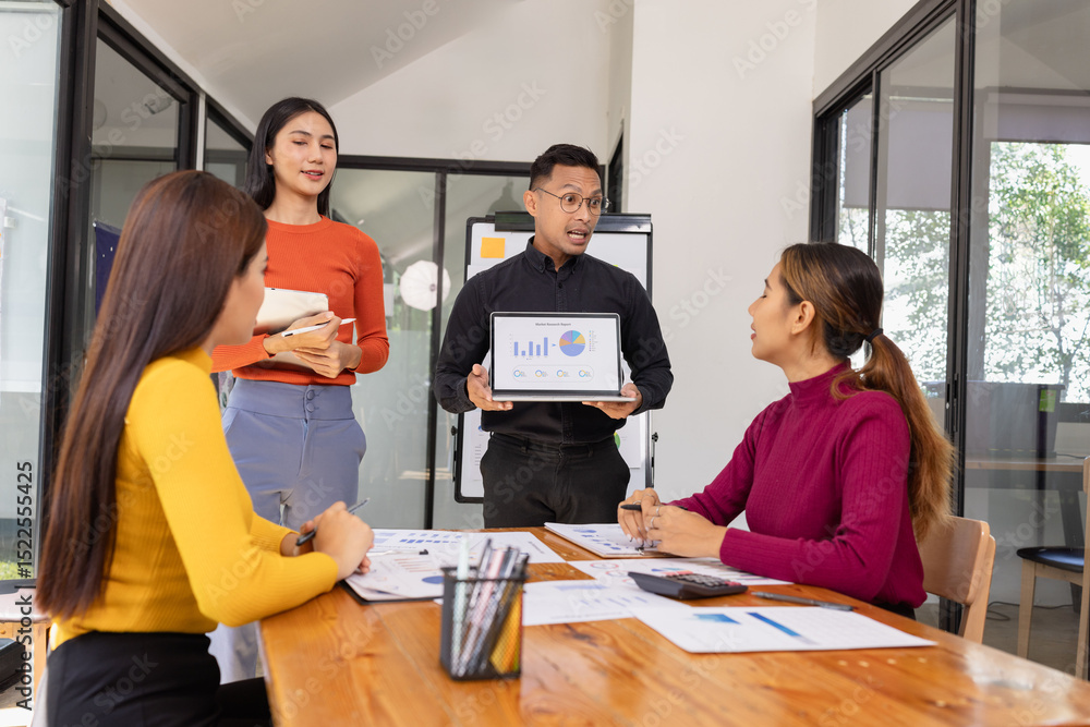Group of Asian business people holding laptop computer working together and presentation a meeting in office, Business person group and new idea project creative concept.