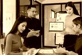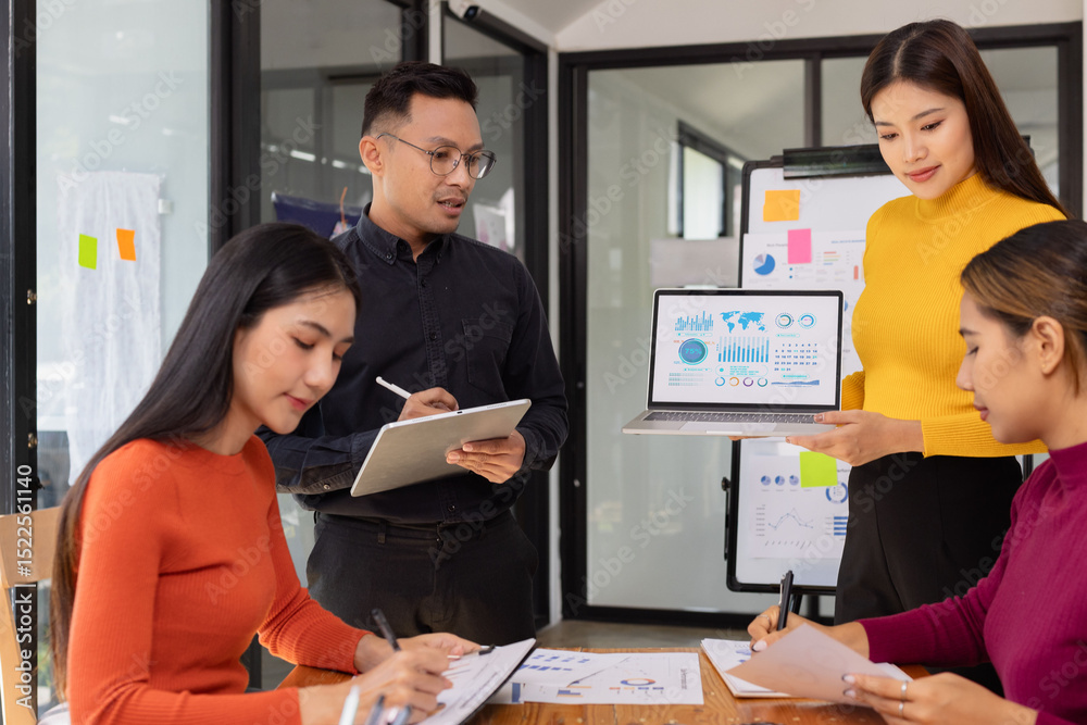 Group of Asian business people holding laptop computer working together and presentation a meeting in office, Business person group and new idea project creative concept.