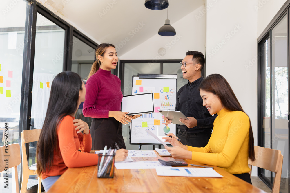 Group of Asian business people working together to presentation with dashboard analysis data management a meeting table in office, Business investment metrics or planning concept.
