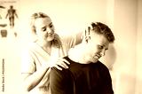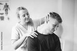 A Modern rehabilitation physiotherapy woman worker with man client leg treatment