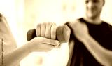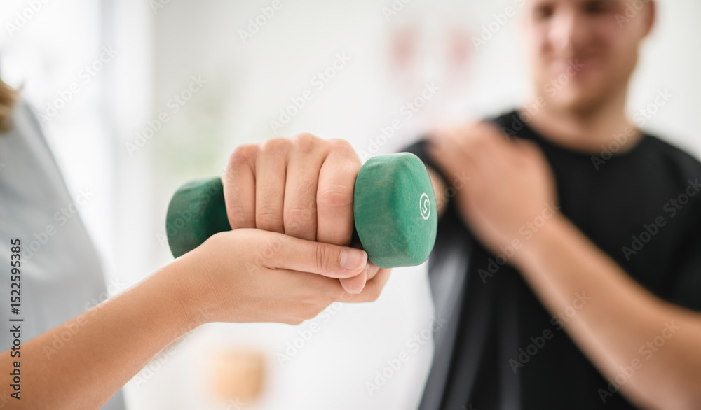 A Modern rehabilitation physiotherapy woman worker with man client leg treatment