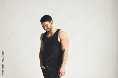 Portrait of young attractive man with muscular strong black beard, piercing sexy look in the studio posing t-shirt