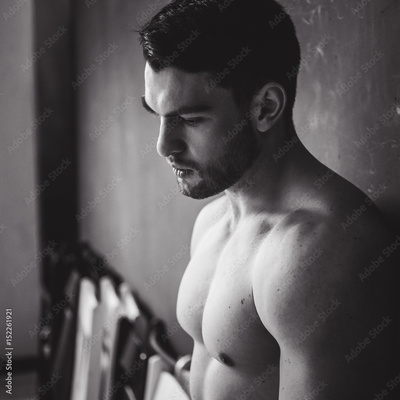 Portrait of young attractive man with muscular strong black beard, piercing sexy look in the studio posing