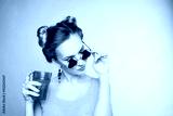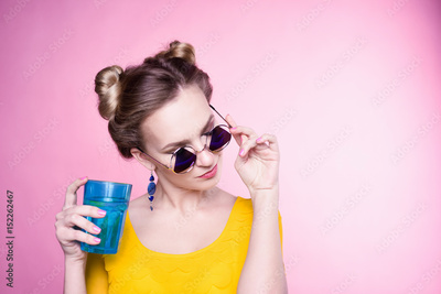 close-up portrait of a beautiful young blonde girl in fashionable sunglasses on a pink background in the studio in a yellow blouse with a blue glass cup of water in his hands with nail polish smiling