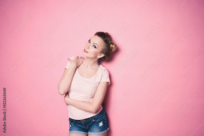 close-up portrait of young beautiful slim sexy young blonde woman in a retro pin-up style on pink background in studio wearing sunglasses smiling and posing