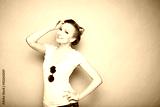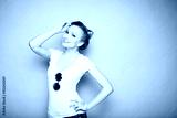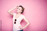 close-up portrait of young beautiful slim sexy young blonde woman in a retro pin-up style on pink background in studio wearing sunglasses smiling and posing
