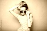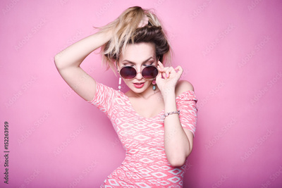 close-up portrait of young beautiful slim sexy young blonde woman in a retro pin-up style in sexy dress with red sensual lips on pink background in studio wearing sunglasses smiling and posing