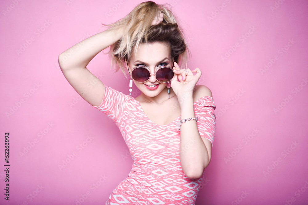close-up portrait of young beautiful slim sexy young blonde woman in a retro pin-up style in sexy dress with red sensual lips on pink background in studio wearing sunglasses smiling and posing