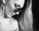 close-up portrait of young beautiful slim sexy young blonde woman in a retro pin-up style in sexy dress with red sensual lips on pink background in studio wearing sunglasses smiling and posing