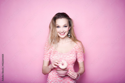 close-up portrait of a young girl hipster slender beautiful blonde bright eat sweet donuts lifestyle posing and smiling on a pink background in pink sexy dress