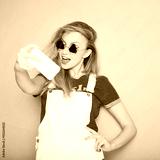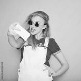close-up portrait of a beautiful young blonde girl in fashionable sunglasses on a pink background in the studio in white overalls and a T-shirt holding a popular phone smiling It makes selfie