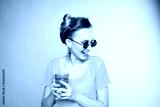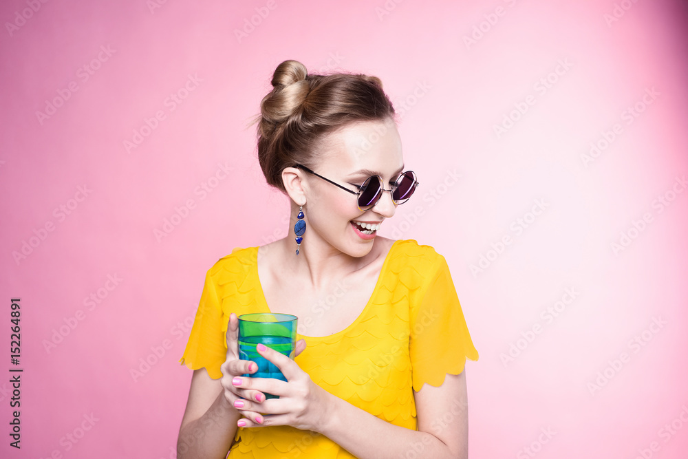 close-up portrait of a beautiful young blonde girl in fashionable sunglasses on a pink background in the studio in a yellow blouse with a blue glass cup of water in his hands with nail polish smiling
