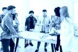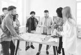 Multiracial group of young people in casual wear working together in collaborative project. Diverse team of students or colleagues standing around desk, brainstorming, discussing ideas, planning work.