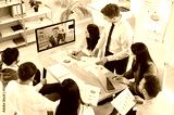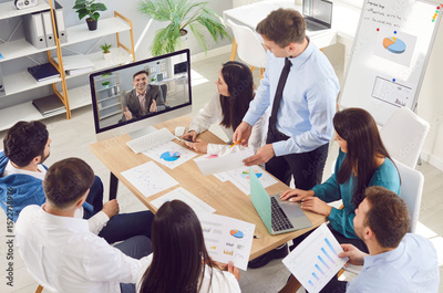 Professional business marketing team having a work meeting in the office, sitting around a table, and having a video call with their manager. Remote communication, teamwork concept