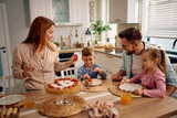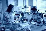 Happy parents and their kids eating cheesecake for dessert at dining table.