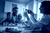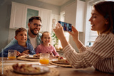 Happy family having fun while taking pictures at dining table.
