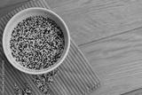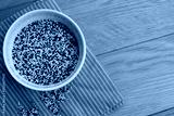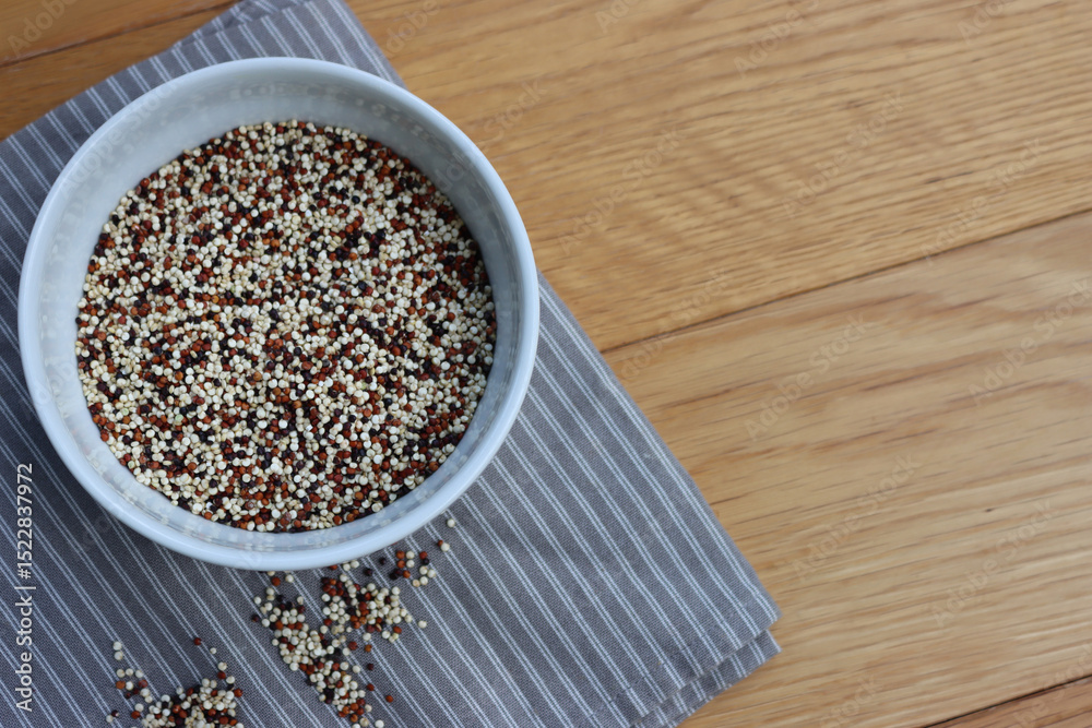 Top view of mix of raw black, red and white quinoa seeds in a ceramic bowl on wooden table