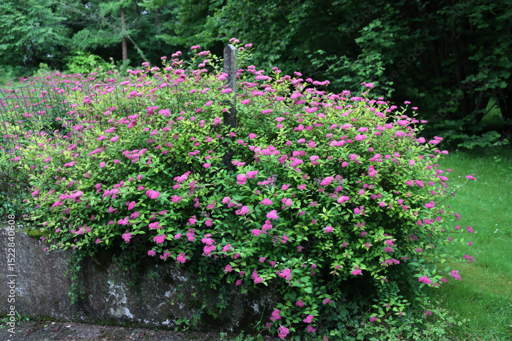 Pink japanese Spirea or Spiraea flower in the garden on springtime. Spirea japonica