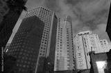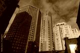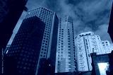 Looking up at urban skyscrapers