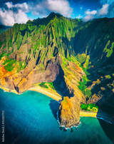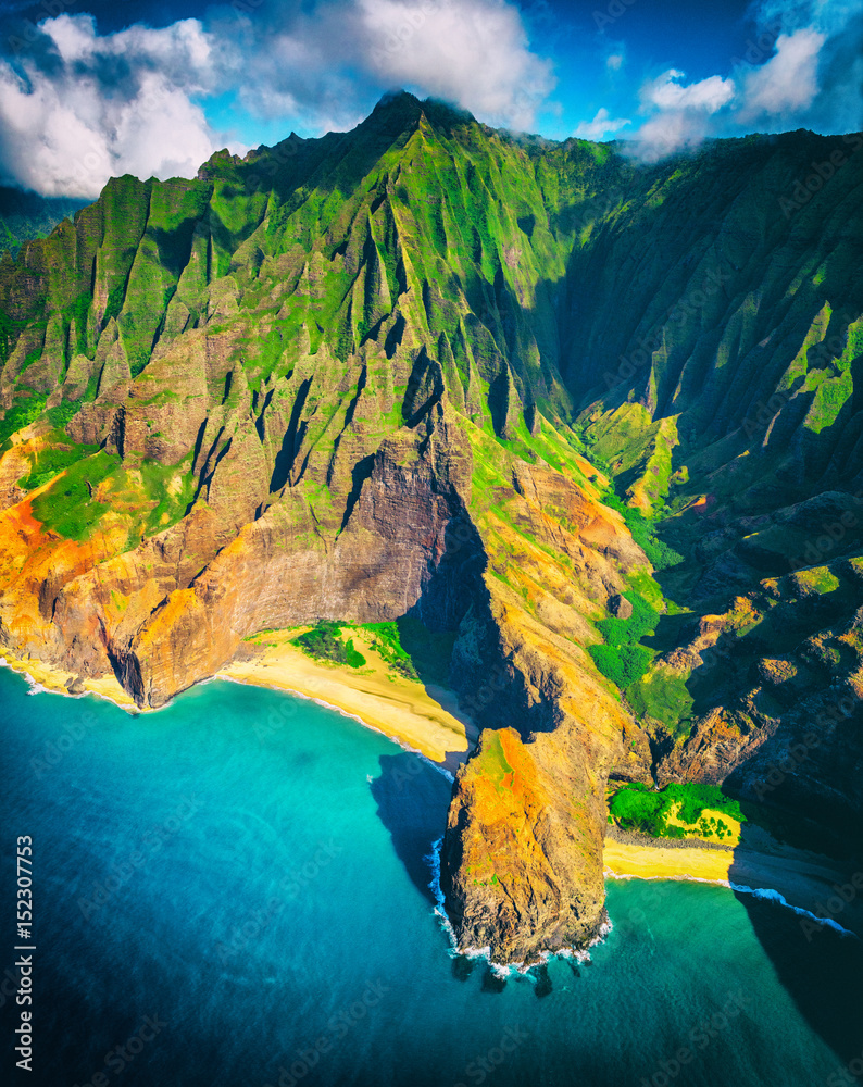 Hawaii beach, Kauai. Na pali coast aerial helicopter view from above. Hawaiian travel destinaton. Napali coastline in Kaui, Hawaii, USA. Aerial of Honopu arch.