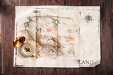 Fake vintage old broken map on wooden desk with compass. Pirates treasure map