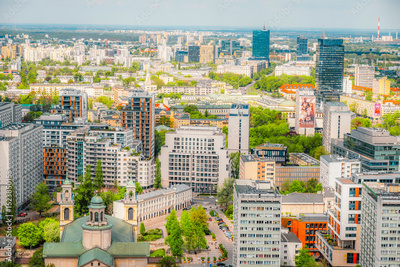 Panoramic view of modern skyscrapers and business centers in Warsaw. View from Palace of Culture and Science in Warsaw, Poland.
