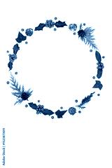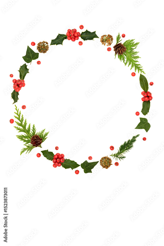 Christmas winter nature wreath with traditional holly, ivy, cedar fir and loose red berries. Minimal abstract natural design for Xmas Season.