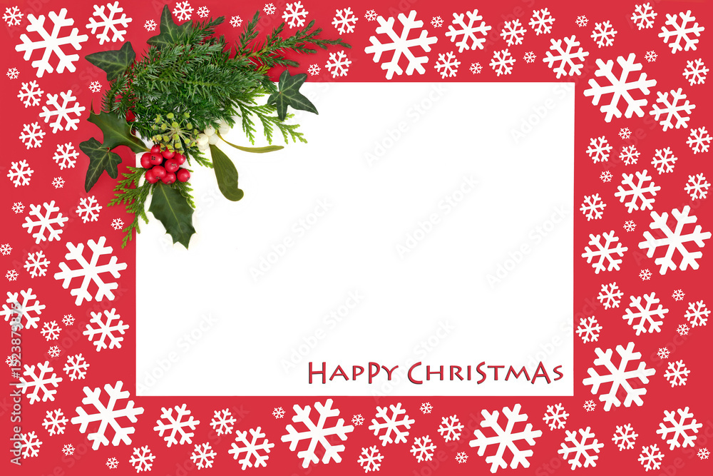 Happy Christmas winter nature flora background, white snowflakes with holly, mistletoe, ivy fir. Festive design for the Xmas winter solstice holiday season. Phrase.
