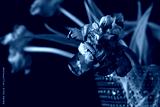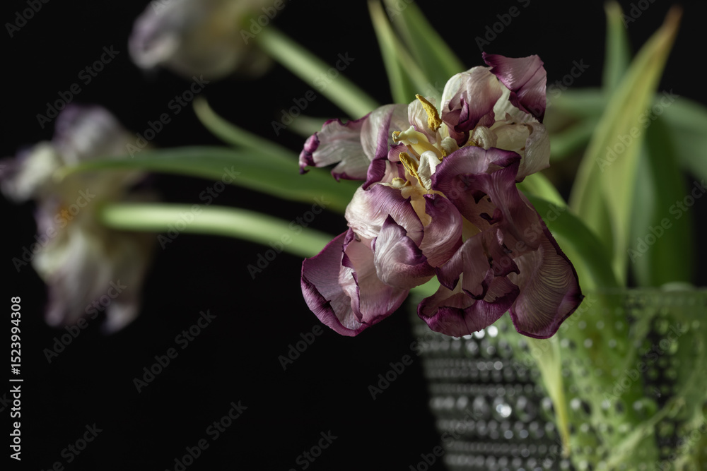 A bouquet of wilted parrot tulip flowers on the black background. Symbol of death, mourning, and the memory of a beloved who has passed, sense of loss and transience
