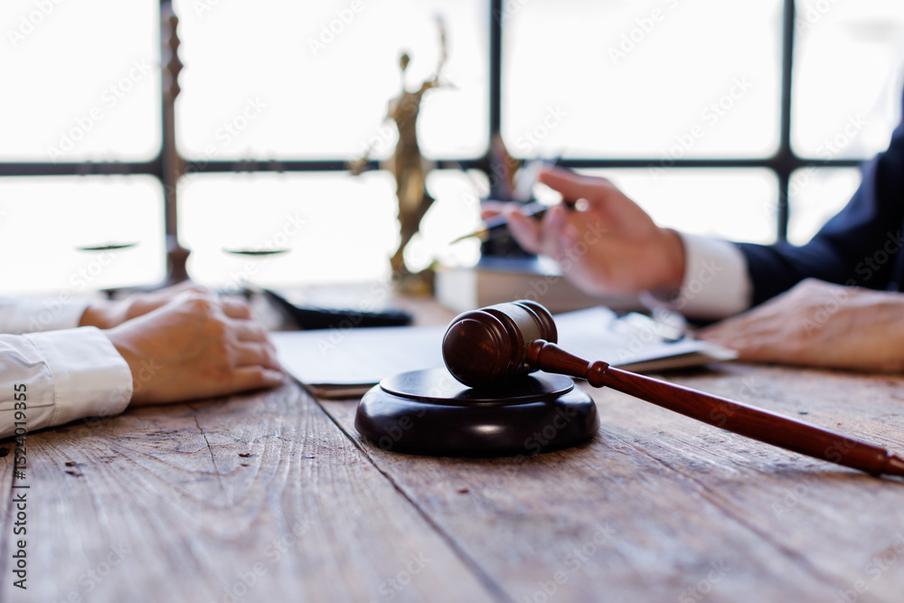 Two lawyers Consultation and conference discussing legal matters at a desk with a gavel, scales of justice law symbolizing law and justice, justice and lawyer Business partnership meeting concept.