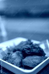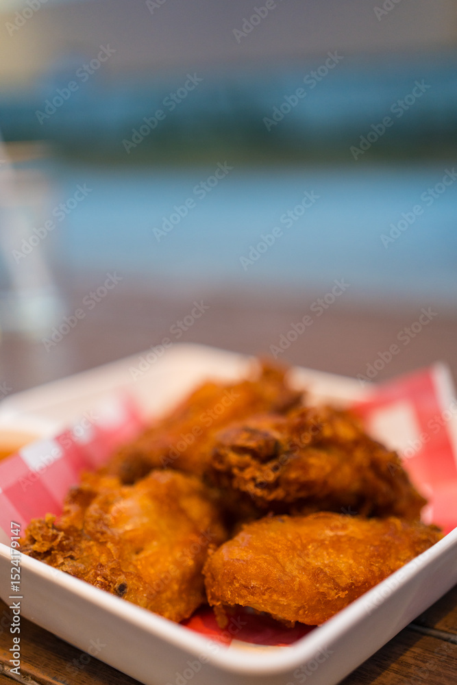 Fried fast food chicken wings on white dish.