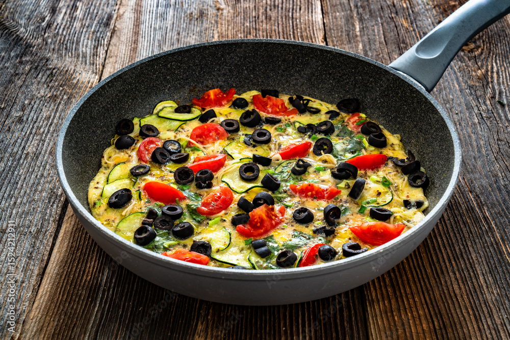 Omelette - scrambled eggs with black olives, zucchini and tomatoes in pan on wooden table