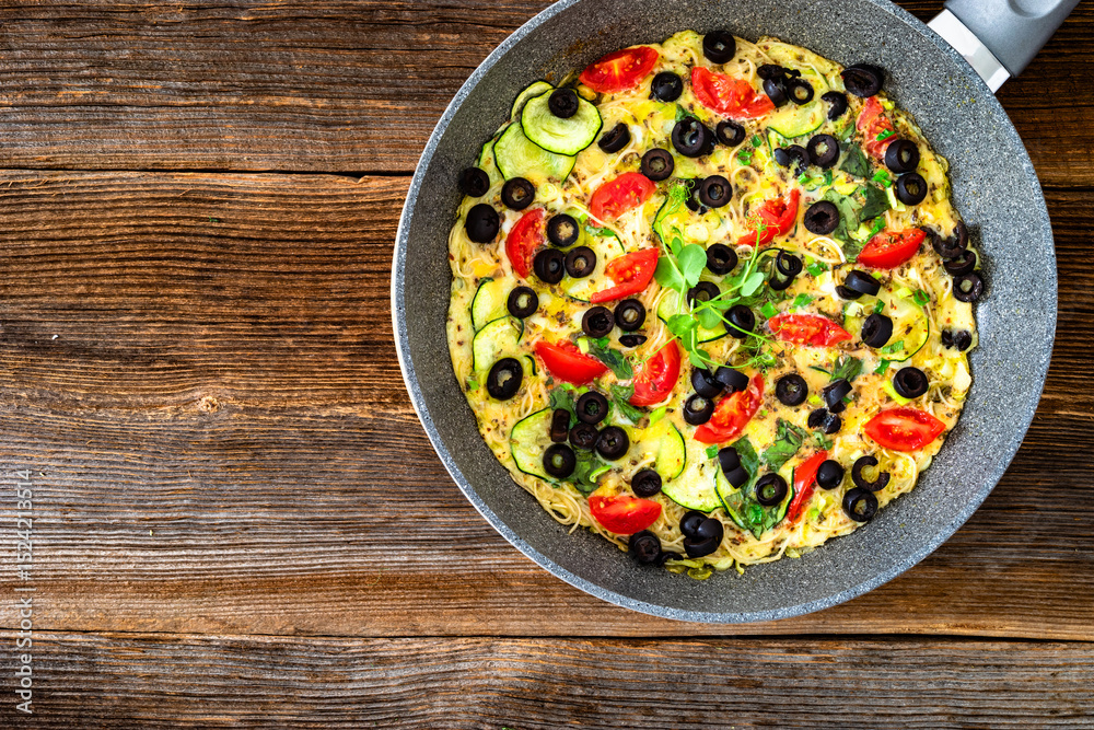 Omelette - scrambled eggs with black olives, zucchini and tomatoes in pan on wooden table