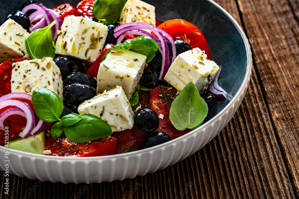 Greek style salad - tomatoes, cucumber with feta cheese, basil leaves and black olives on wooden table