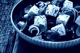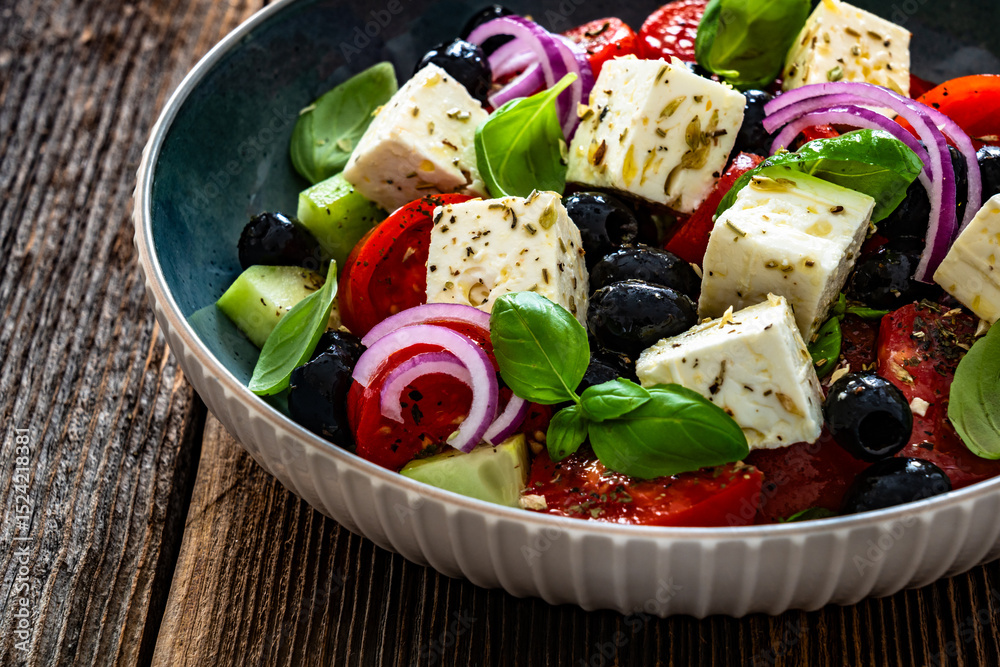 Greek style salad - tomatoes, cucumber with feta cheese, basil leaves and black olives on wooden table
