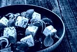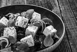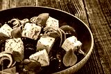 Greek style salad - tomatoes, cucumber with feta cheese, basil leaves and black olives on wooden table