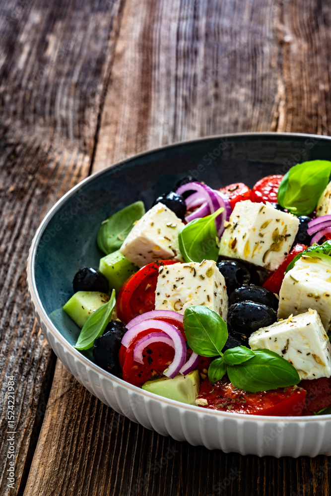 Greek style salad - tomatoes, cucumber with feta cheese, basil leaves and black olives on wooden table