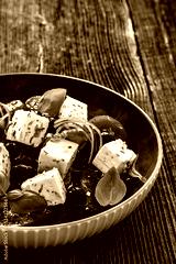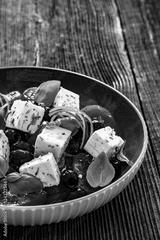 Greek style salad - tomatoes, cucumber with feta cheese, basil leaves and black olives on wooden table