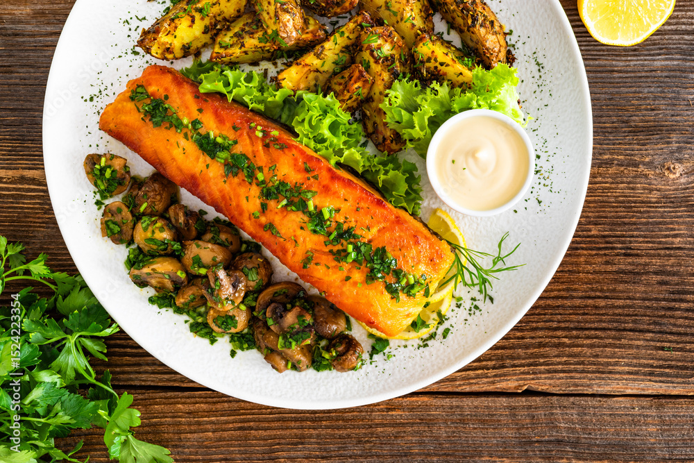 Seared salmon steak with champignons, mayonnaise and baked potatoes on wooden table